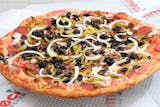Pepperoni, sausage, meatballs, onions, green bell pepper, mushrooms and black olives.