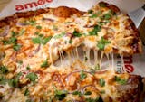 Mozzarella cheese, chicken, topped with amici alfredo sauce, red onions, and roasted garlic, (no pizza sauce).