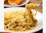 Red or white. Linguini noodles with baby clams, fresh garlic black pepper, white wine and parsley.