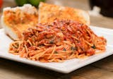 Sliced breaded eggplant deep fried on a bed of spaghetti or angel hair noodles topped with marinara sauce and mozzarella cheese baked in the oven.